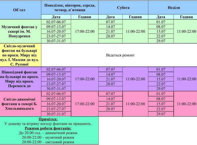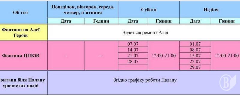 Управління ЖКГ Чернігівської міськради інформує про графік роботи фонтанів у Чернігові у липні місяці.