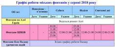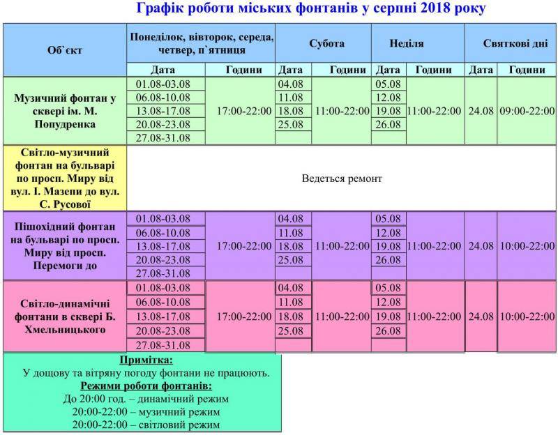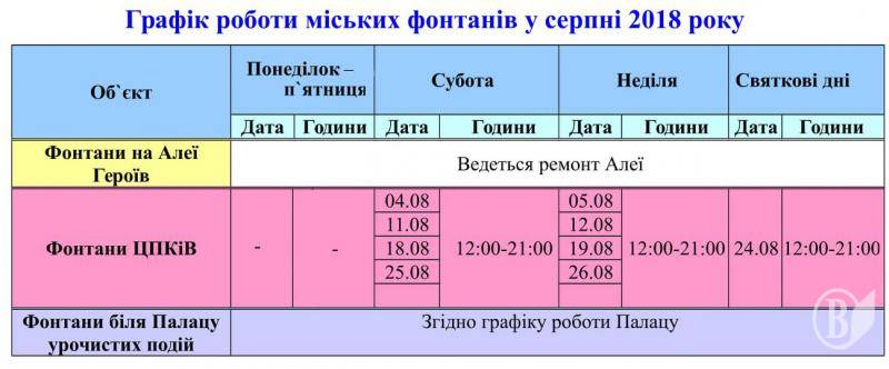 У табличках нижче – графік роботи «водичок», тобто фонтанів у Чернігові у серпня місяці 2018-го.
