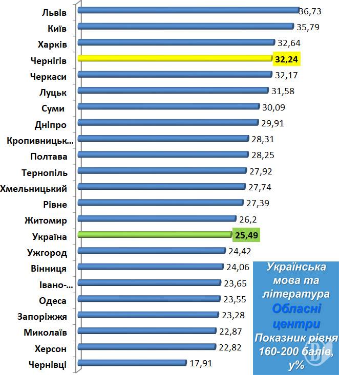 Чернігів тримає стабільно високу планку, з тенденцією до покращення: цього року дещо зменшена кількість випускників, що склали ЗНО на низькому рівні 100-140 балів. Відповідно якість на найвищому рівні - від 180 до 200 балів - досягла 25% (+4%).