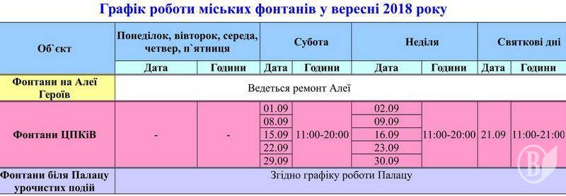 Графік роботи фонтанів Чернігова на вересень місяць