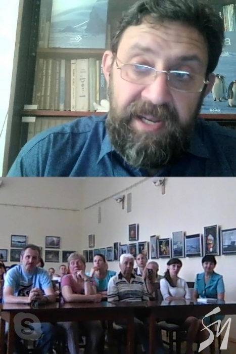 Скайп-спілкування з автором експозиції доповнювалося переглядом відео краєвидів Антарктиди, зокрема була показана підводна зйомка, зроблена Андрієм Утєвським.