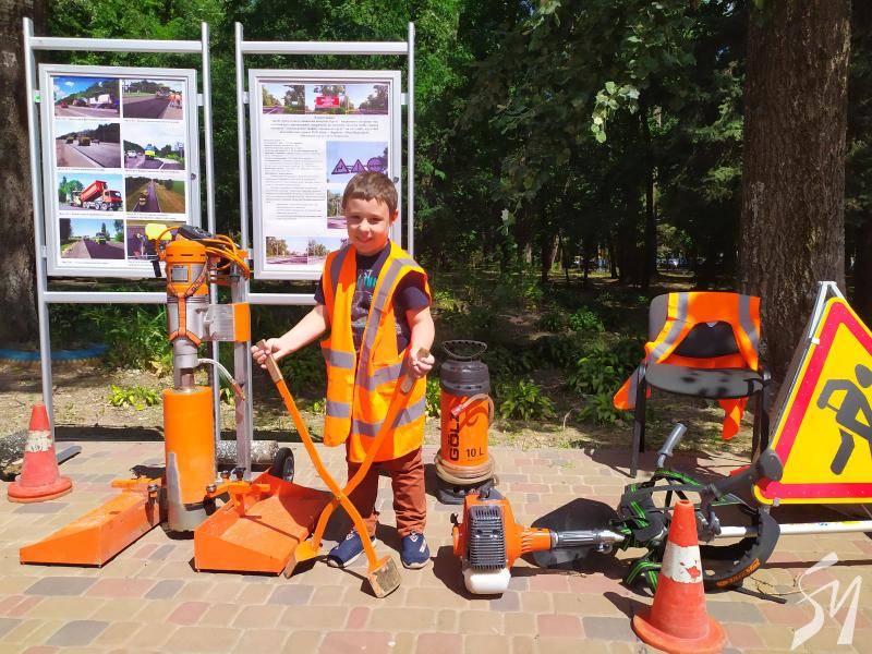 Тут були і дорожній каток, навантажувач, фреза, повітрядувка, маркувальна машина для нанесення розмітки, кущоріз, керновідбірник, курвиметр, пірометр, дорожні знаки та конуси. Дітлахи, що прийшли знайомитись з професією дорожника, були в захваті.