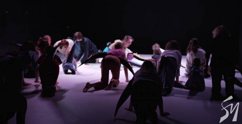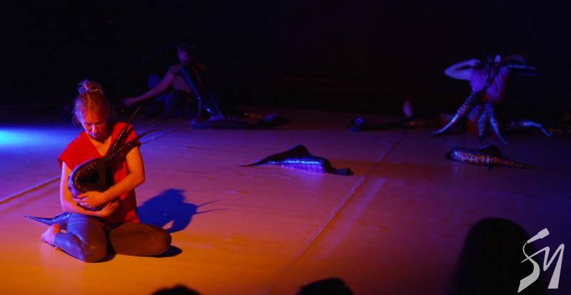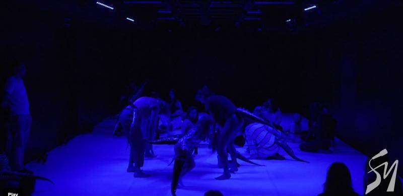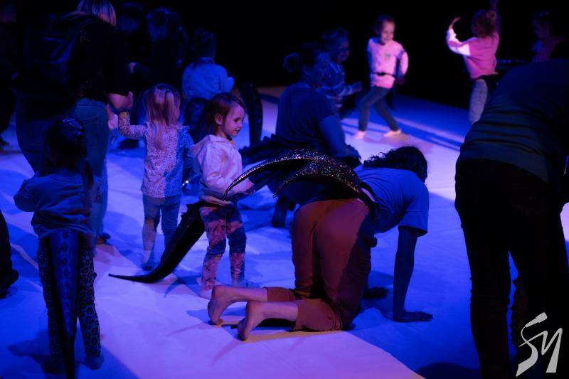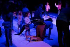 Таємниче дійство. Маленькі глядачі знову сиділи по боках великого килима на м’яких матах. Тьмяне світло спочатку. Промінь прожектора. Здавалося ми перемістилися у часі на мільйони років у минуле, аби побачити, як зароджувалося життя на планеті Земля. Якісь істоти з хвостами виходили з моря на берег. Починалося зовсім інше життя.