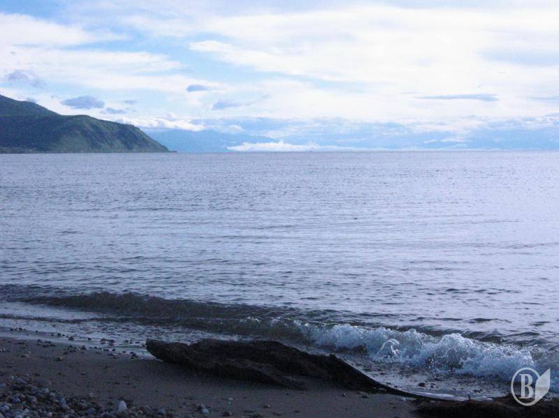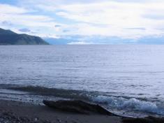 Во время путешествия 2006 года я трижды ночевал на Южном Байкале, а вот на Северный попал впервые. Вода здесь значительно чище, чем в районе Слюдянки или Байкальска. Даже без бинокля четко был видно восточный берег озера и горные пасма Баргузинского хребта, а над серыми волнами Байкала висели такие же серые и мрачные тучи.