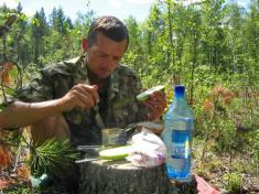Палатку установил почти на берегу озера, неподалеку от меня в трех других палатках стояли туристы с катамаранами. Разложить костёр и вскипятить воду для приготовления ужина не удалось, потому что дождь намочил все дрова, а примуса я с собой не вожу. Пришлось удовлетвориться скромной трапезой: печеньем, яблоком и минеральной водой.