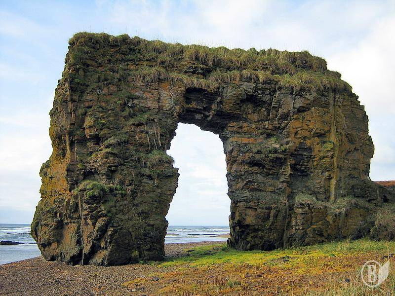 В одном месте увидел очень красивый водопад – низенький, широкий, грохочущий плотной массой ниспадающей воды. Вскоре дошел до арки Стеллера – чуда, созданного природой. Арка поражает в первую очередь своей мощностью: поперек берега стоят две массивные каменные опоры, смыкаясь сверху. Фотографировать арку Стеллера – наслаждение. Возможны разные ракурсы, но лучше всего – впритык, охватывая вдали скалистый полукруг бухты. Интересно, что сто лет тому назад арка Стеллера имела другое, оригинальное название - Штаны Тетеринова. Кем был тот Тетеринов и на самом ли деле арка так напоминала его штаны, сегодня уже неизвестно.