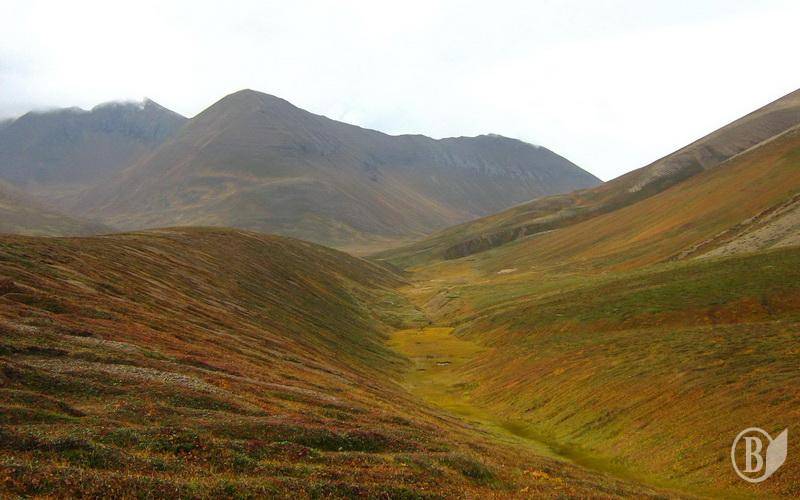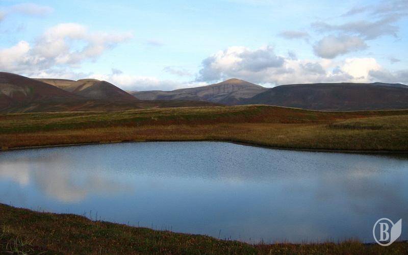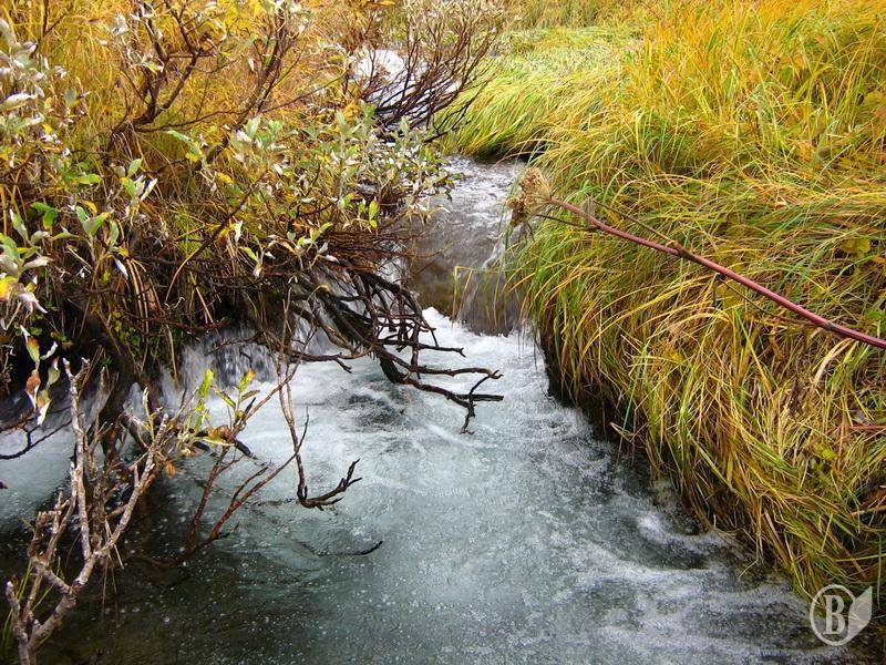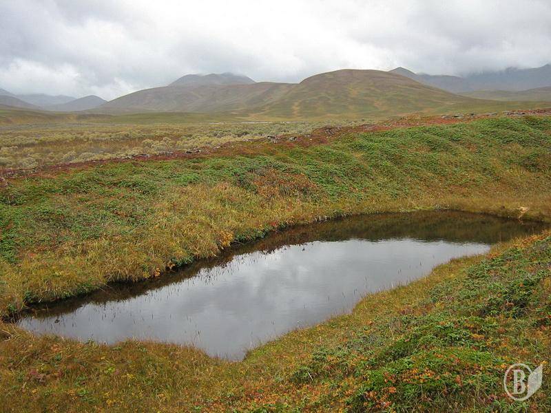 В Половинной долине немало маленьких озерец, а то и просто луж с прозрачной водой и песчаным дном. Они наполняются водой из-под земли, о чем свидетельствовали воронки и отверстия в песке на дне этих водоемов. На привалах лакомился черникой, брусникой, шикшей. Взошел на водораздельный перевал, отсюда Берингового моря уже не было видно.