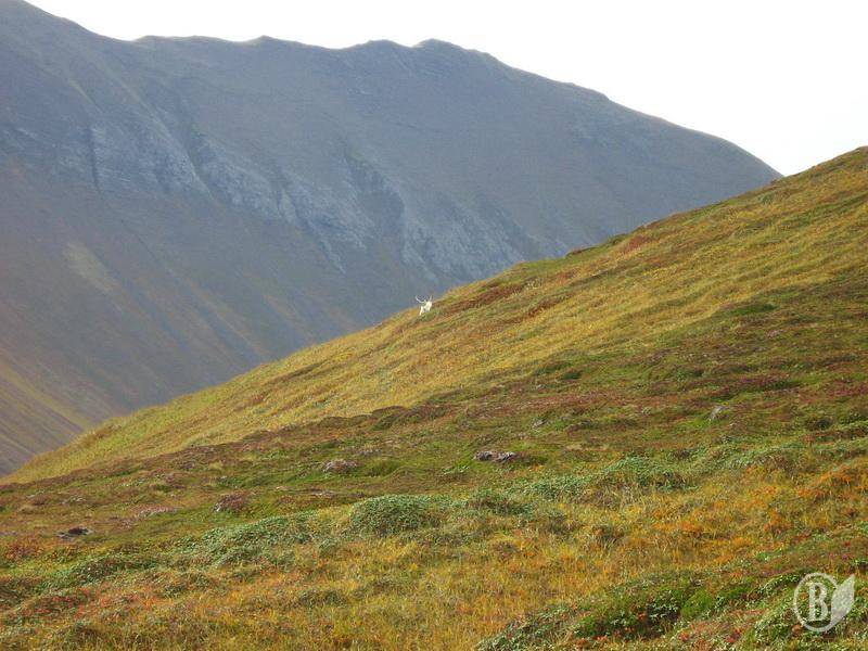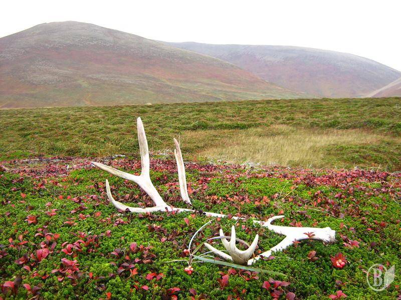 И в конечном итоге болото закончилось и началась нетронутая командорская тундра: невысокие кустики с неизвестными мне красными ягодами, черника, грибы, ручьи, небольшие и неглубокие озерца, с чистой и прозрачной водой. Сверяя свой путь по карте, натолкнулся в тундре на оленьи рога.