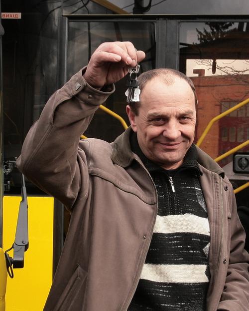 Чернігівське тролейбусне управління випустило на маршрут нові тролейбуси. Василь Олександрович Швидченко з ключами від новенького ЛАЗу. © Віктор КОШМАЛ