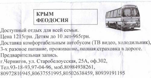 Отдых в пгт. Приморское (10 км от Феодосии) длился 10 дней. Оплата за проживание – 30 грн. на день, питание – полсотни. Путешествие на старом"Икарусе"без кондиционера длилась в жару почти 20 часов.