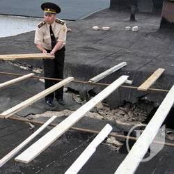 Обвал случился 26 июня в 13:00. Две плиты крыши на пристройке онкодиспансера упали на чердак. Ещё две зависли.