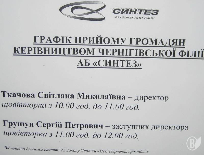 «В связи со временным отсутствием в кacсе банка необходимой Вам суммы наличных средств, что является следствием финансовой и политической нестабильности в стране, ЧФ АБ «Синтез», к сожалению, на данное время не может выплатить Вам денежные средства по депозитному договору.