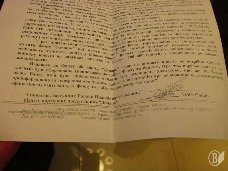 А потому нужно писать заявления в банк «Демарк» с требованием выплатить сумму вклада или остатка на платежном балансе.