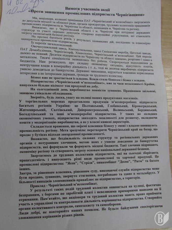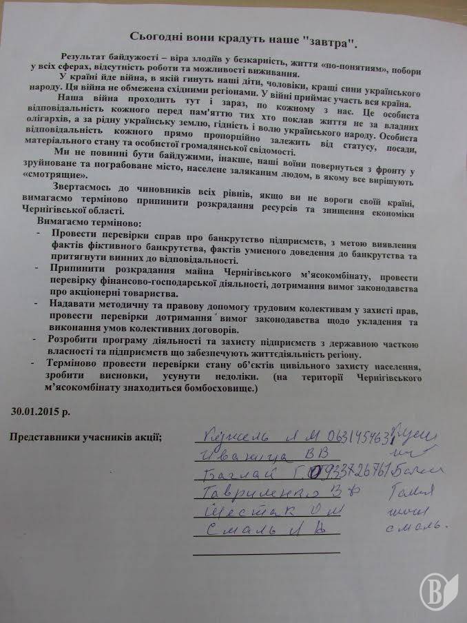 Вони звертаються до депутатів міської та обласної ради та прокуратури із вимогою розібратися із ситуацією довкола Чернігівського м’ясокомбінату.