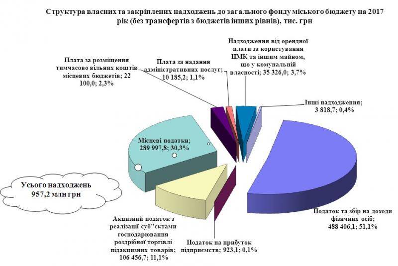 У 2017 році планується отримати 1 018,9 млн грн власних доходів, що на 16,9 % більше уточненого річного планового показника 2016 року, у тому числі, доходи загального фонду – 957,2 млн грнабо на 17,0 % більше уточненого річного планового показника 2016 року, доходи спеціального фонду – 61,7 млн грн(або на 15,1 % більше уточненого річного планового показника 2016 року), з них бюджет розвитку – 13,5 млн грн або на 28 % більше, ніж очікується мобілізувати у 2016 році.