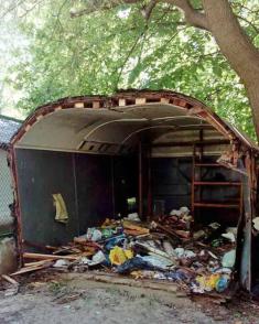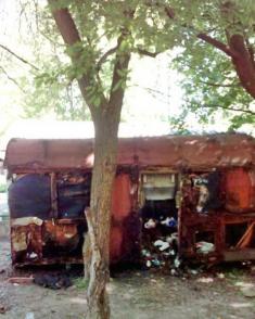 Споруда роками знаходилася біля входу в дитячий садок № 72 на вул. Бєлова, 30А. Це була будка, що встановлювалася на шасі вантажного автомобіля. Всередині було сміття.