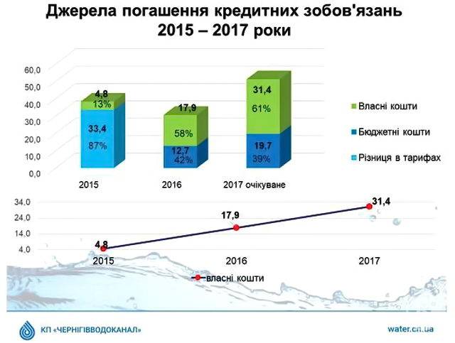 Підприємство суттєво збільшило частку власних коштів в розрахунках за кредитом з 13% у 2015 році до 58% в 2016 році. Це завдяки більш чіткому дотриманню затвердженої структури тарифів, раціональному веденню господарської діяльності та цільовому акумулюванню коштів для розрахунків за кредитними зобов’язаннями.