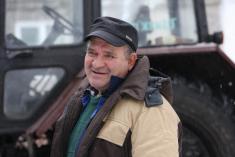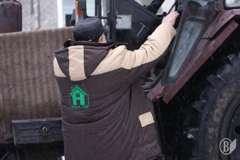 Тракторист Володимир Зименок уже 13 років працює на цьому тракторі. Сьогодні зранку він працював на розчищенні територій на вулиці Пухова, а після 11 години - на вулиці Доценка.