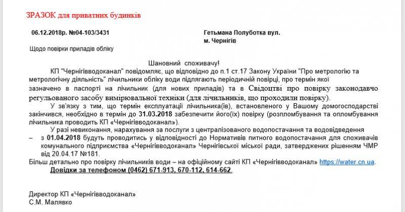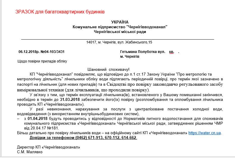 Також, відповідно до Наказу по КП «Чернігівводоканал» № 299 від 06.12.2017, абонентський відділ має повідомляти абонентів квартирні лічильники яких підлягають періодичній повірці згідно графіку, про необхідність її проведення в межах міжповірочного інтервалу та в строк визначений в повідомленні.