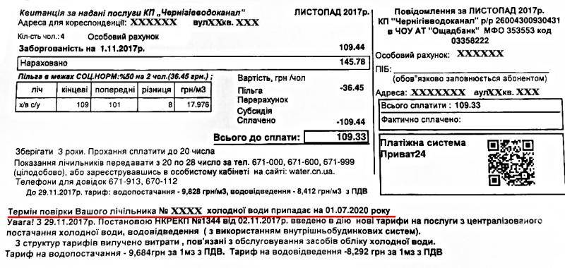 КП «Чернігівводоканал» повідомляло, що з 29 листопада 2017 року за рахунок виключення із структури тарифу витрат на повірку лічильників холодної води, зменшено тариф на послуги з централізованого постачання холодної води й водовідведення (з використанням внутрішньобудинкових систем).