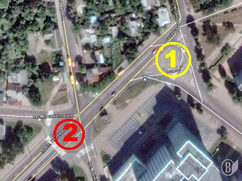Нагадуємо, що 18 серпня на перехресті просп. Перемоги та вул. Молодчого (район 5 кутів, поруч, за півсотні метрів) також було змінено схему руху автотранспорту на кругову – коло №1 на схемі нижче:
