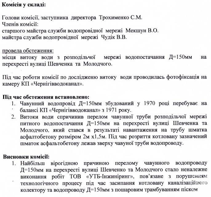 За висновками комісії КП «Чернігівводоканал», в переломі водопровідної труби Д=150 мм, який стався 13 жовтня винною є компанія «УТБ-Інжиніринг», яка проводила реконструкцію колектору. Звісно, брила асфальту з’явилась на водогоні не навмисно, а скоріш за все, під час проведення робіт через навантаження на край асфальту, яке створила важка будівельна техніка. При засипанні котловану асфальтобетон, який обвалився, просто не помітили.