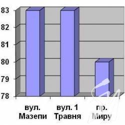 А ось центральна вулиця, що ділить Чернігів на райони – проспект Миру – виявилась дещо тихіша – 70-80 дБА.