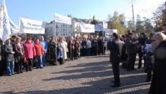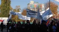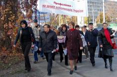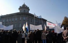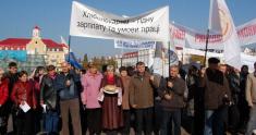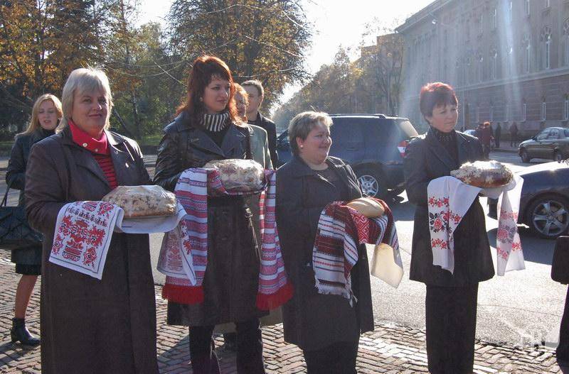 С караваями в руках и плакатами митингующие колонной прошли по центральным улицами города на площадь и остановились напротив здания облгосадминистрации. Их цель – требовать увеличения рентабельности с 5 до 10%.