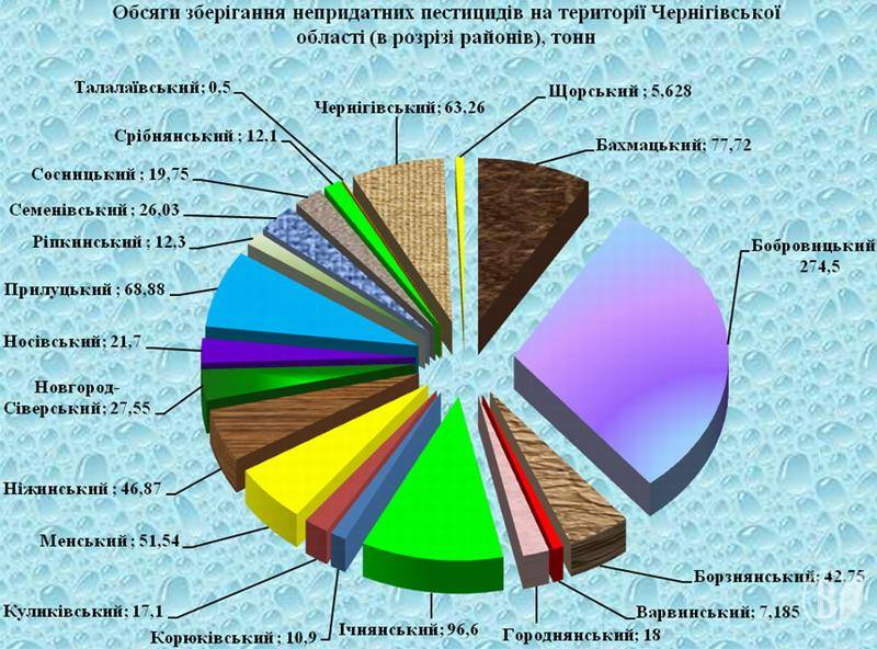 По данным комплексной инвентаризации в прошлом году и с учетом изменений, которые состоялись в течение последнего времени, в Черниговской области непригодные и запрещенные к использованию химические средства защиты растений, общим объемом около 900 тонн, хранятся в 206 местах, из них 74 находятся в неудовлетворительном состоянии, где учитывается около 267 тонн пестицидов и в 23 местах – 52 тонны бесхозяйственных.