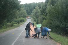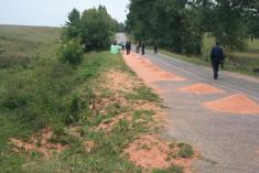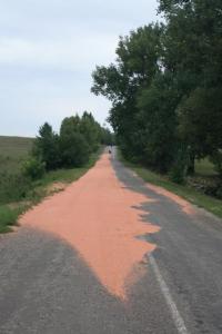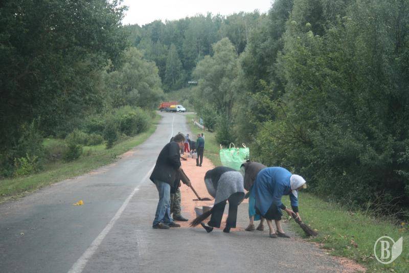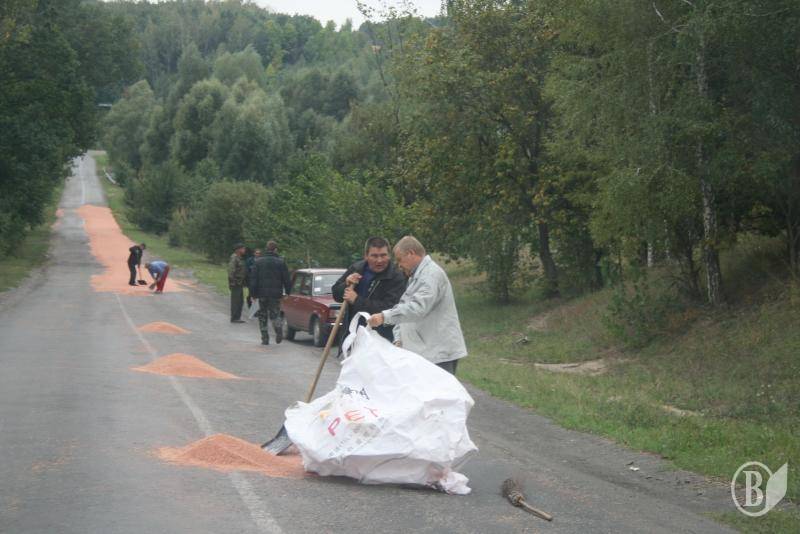Вся дорога була всипана товстим шаром зерна пшениці, причому зерна незвичайного, якогось дивного яскраво-оранжевого кольору. Десь зо два десятки людей на чолі з керівником ПСП “Сокиринське” В. Г. Лазарєвим намагались за допомогою віників, відер та лопат зібрати його з проїжджої частини.