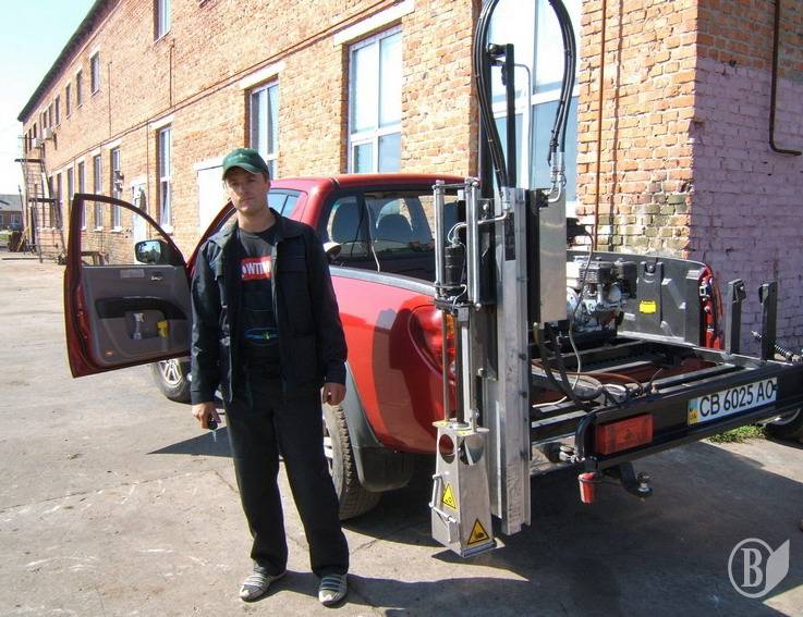 Машина со специальным устройством, которое проверяет плодородие почвы, и ее водитель Андрей