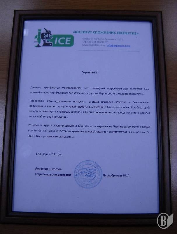 Сертифікат, що був вручений голові правління ЧМЗ Валентину Галичу, засвідчує, зокрема, що на цьому підприємстві дотримуються «всіх технологій, нормативів та стандартів щодо виробництва молочної продукції – причому як світових – ISO 9001, так і українських ГОСТів», які регулюють дане виробництво.