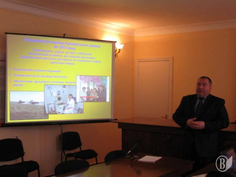 Прес-тур організований Медіа-центром «Моє місто» розпочався зі знайомства з «головами» Куликівщини - головою райдержадміністрації Олегом Шпаком і головою районної ради Сергієм Калашником. Під час відео-презентації вони розповіли про історію утворення району та його символи. Так, на гербі та прапорі Куликівщини ми побачимо птаха кулика. На цій території проживає 18 тисяч людей, існує 25 населених пунктів, діють 30 сільгоспформувань різних форм власності. Земельний фондстановить 94403 га сільськогосподарських угідь, з них – 26429 га надані в оренду сільськогосподарським підприємствам.