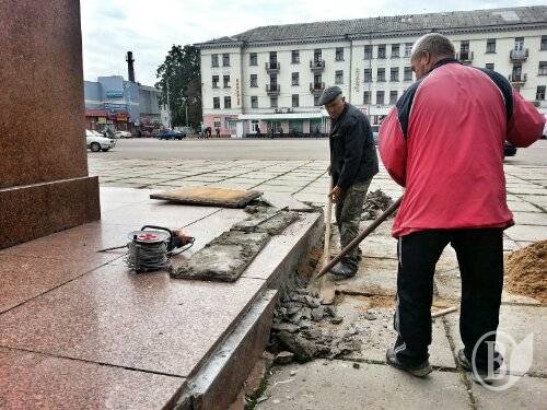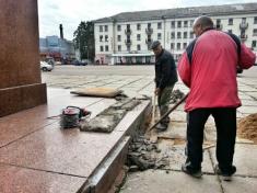 Працівники СЄЗу, намагаючись хоч щось зробити, щоб пам’ятник став красивішим, «латали» плити на підніжжі, акуратно викладаючи кам’яну смужку за смужкою. Комунальники виявились небагатослівними й не поділились навіщо вони проводять ремонт та хто є замовником робіт.