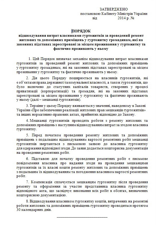 А також - "Порядок відшкодування витратвласниками гуртожитків за проведений ремонт житлових та допоміжних приміщень у гуртожиткугромадянам, які на законних підставах зареєстровані за місцем проживання у гуртожитку та фактично проживають у ньому».
