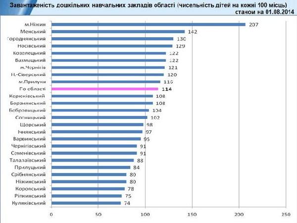 В соответствии с Программой социально-экономического развития к 416 дошкольным учебным заведениям, которые охватывают 90,3% детей от 3 до 6 лет, должно добавиться еще 10. Однако проблемной остается их перегрузка. При областном показателе 114 детей на 100 мест, в Нежине он составляет 207.