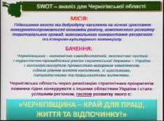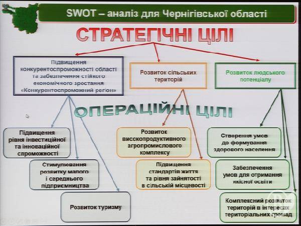 Вона проаналізувала сильні й слабкі сторони та можливі зовнішні впливи (можливості та загрози) на подальший соціальний та економічний розвиток Чернігівської області.