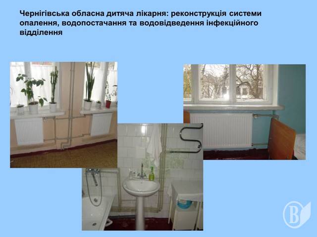 Здійснено реконструкцію системи опалення, водопостачання та водовідведення інфекційного відділення Чернігівської обласної дитячої лікарні; у вересні розпочато заміну технічного обладнання, трубопроводів систем опалення, водопостачання, водовідведення. На сьогодні там освоєно 624 тисячі гривень.