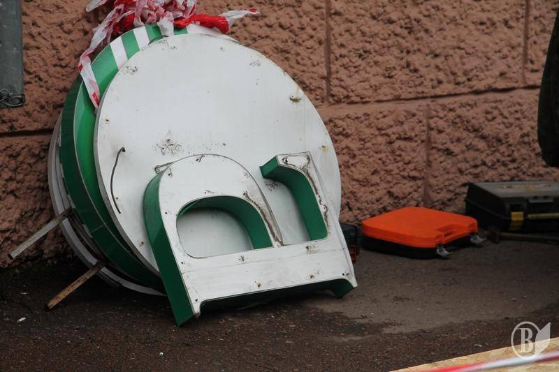 Именно в интересах последней версии говорила новенькая вывеска, которая лежала на земле на проспекте Победы, 100-а.