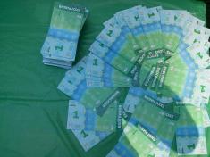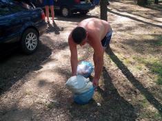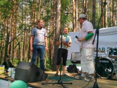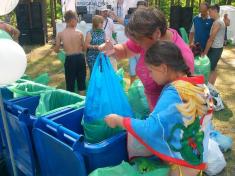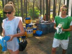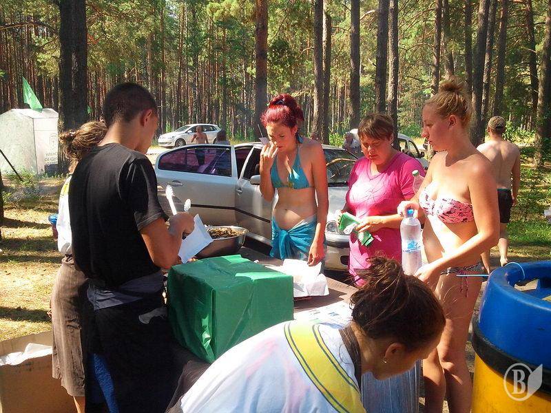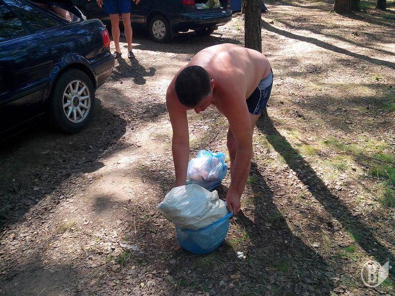 Утром волонтеры ходили вдоль берегов Голубых озер, вручали отдыхающим акционные флаеры, полиэтиленовые мешки и призывали собирать и приносить к локационным пунктам мусор. Кое-кто посмеивался и даже насмехался, а кто-то быстро отзывался. Например, Владимир из Славутича весьма быстро наполнил бумагой и бутылками ПЭТ 2 мешка и получив эко-гривны, обменял их на блюда из гриль-меню и квас.