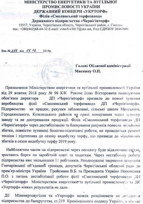 Працівники підприємств звернулися до голови Чернігівської облдержадмінстрації Олександра Мисника терміново вирішити питання призначення керівника ДП «Чернігівторф» і розблокування рахунків Смолинського торфозаводу. У протилежному випадкові шахтарі знову оголосять безтерміновий страйк з виїздом під стіни Чернігівської ОДА. Затягувати більше нікуди. На носі – новий сезон!