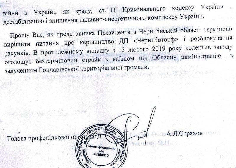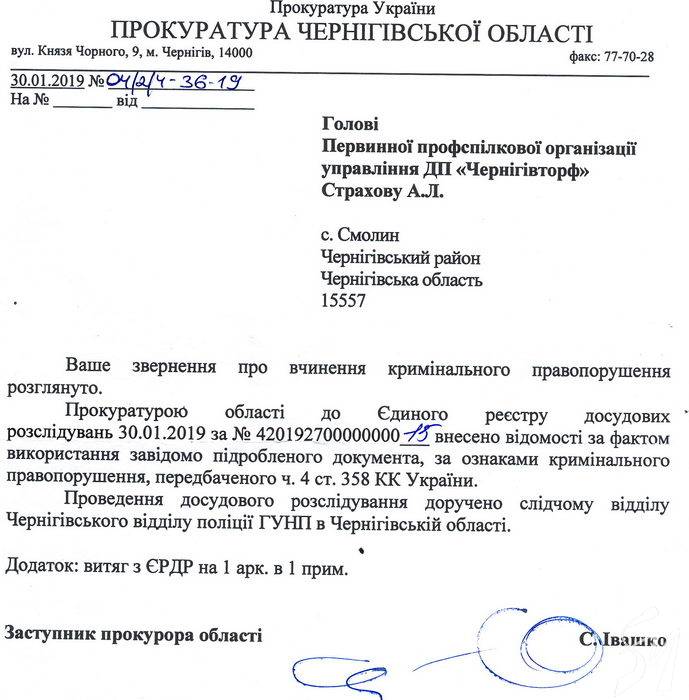 Голова первинної профспілки ДП «Чернігівторф» Андрій Страхов отримав відповідь від прокуратури Чернігівської області, у якій йдеться про порушення кримінального провадження за статтею 258 Кримінального кодексу України – підроблення документів, печаток, штампів та бланків.