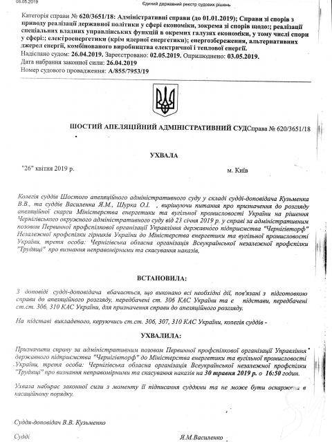 Разом із тим, як стало відомо профспілковим лідерам, шостий апеляційний адміністративний суд в Києві поновив Міненерго строк на апеляційне оскарження рішення Чернігівського окружного адмінсуду, яким було визнано незаконним призначення на посаду в.о. директора ДП «Чернігівторф» Іллі Рокоче.