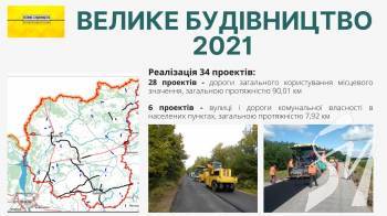 Довідково. На 2021 рік запланована реалізація 34 проєктів ремонту автомобільних доріг загального користування місцевого значення та вулиць і доріг комунальної власності на суму 652,2 млн грн, також буде використано перехідних залишків субвенції минулих років - 109,4 млн грн. З них: