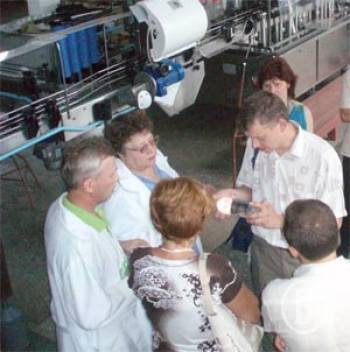 На фото: на производстве «Черниговской водки» Неонила Пионтковска с экспертами и «Спутником» ; первый среди первых - «Спутник» в лаборатории качества предприятия.