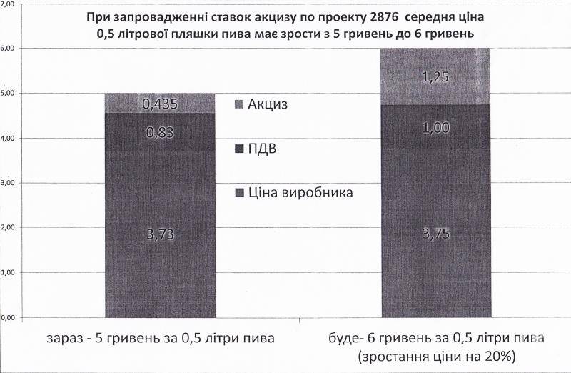 Крім того, чинні ставки акцизів на пиво в Україні у 4,5 раза нижчі за ставки в Росії. Акциз становить менше 9% ціни пива в Україні і тому підвищення ставки акцизу майже втричі підвищить ціну пива лише на 23 %.