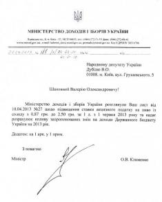 Валерій Дубіль зазначив, що існує і урядовий проект підвищення пивних акцизів, але він жорсткий, від нього може постраждати уся пивна галузь. Урядовим проектом передбачена і акцизна марка, і окрема ліцензія на продаж пива.