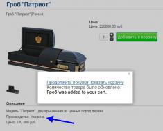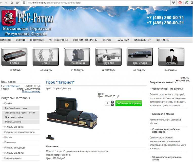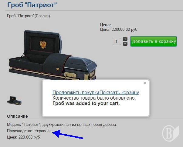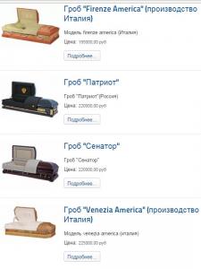 Добре розуміє це і Московская городская ритуальная служба «РСС Ритуал». Вона пропонує москвичам та гостям столиці розкішні (мабуть, навіть комфортні за такі гроші) труни виробництва України.
