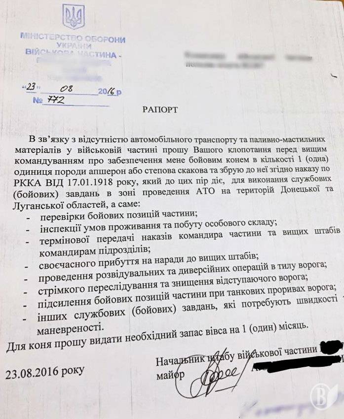 Начальник штаба военной части просит выдать хотя бы коня. Как и положено согласно приказу по РККА от 1918 года, пока еще не отмененному.