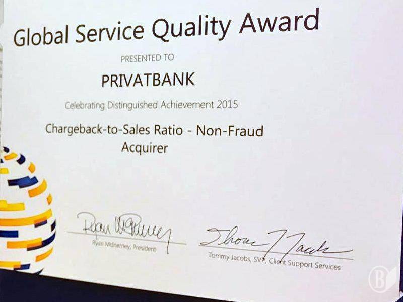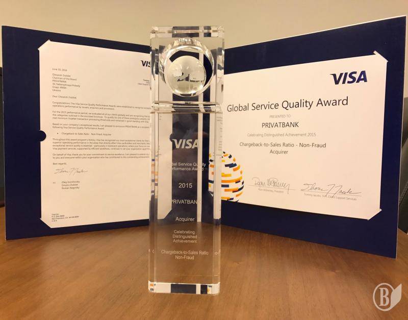 В рамках глобальної програми Visa Global Service Quality Performance Awards, «ПриватБанк» відзначений нагородою в номінації Chargeback–to Sales Ratio-Non-Fraud Chargeback, Acquirer (найменьша частка спірних і шахрайських транзакцій в торговому обороті еквайєра).